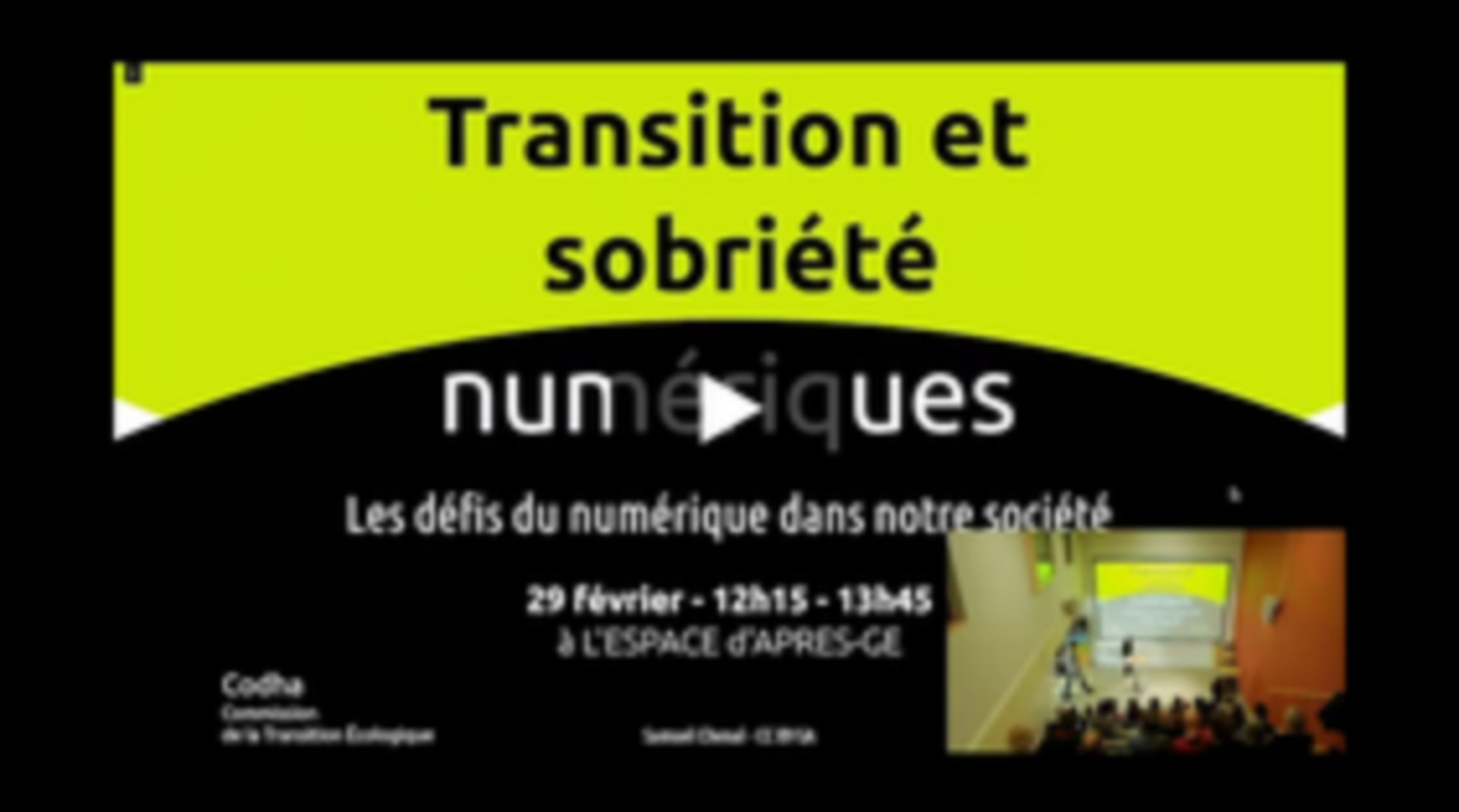 Ella été donnée par Samuel Chenal d'Itopie, et organisée par la Commission de la Transition Ecologique de la Codha. Itopie est une coopérative à taille humaine basée à Genève. Elle milite pour une informatique libre, éthique, durable et citoyenne.